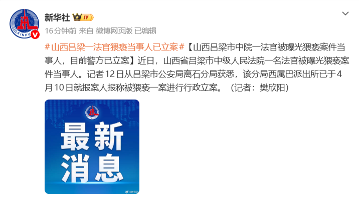 近日,山西省吕梁市中级人民法院一名法官被曝光猥亵案件当事人。记者12日从吕梁市公安局离石分局获悉,该分局西属巴派出所已于4月10日就报案人报称被猥亵一案进行行政立案。