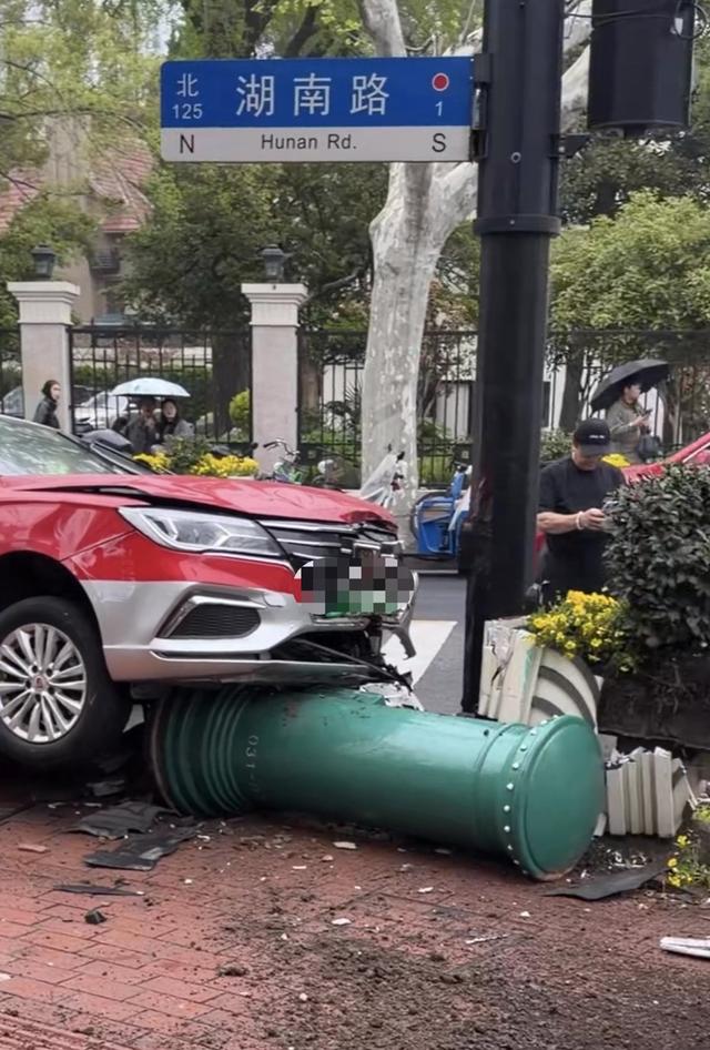 据现场目击市民介绍,事故发生在湖南路淮海中路路口西北角位置。当时看到一辆红色车身的出租车撞上路口便利店门前人行道上的一只邮筒和部分景观花坛,邮筒被撞倒,花坛被撞歪,车头亦严重受损。