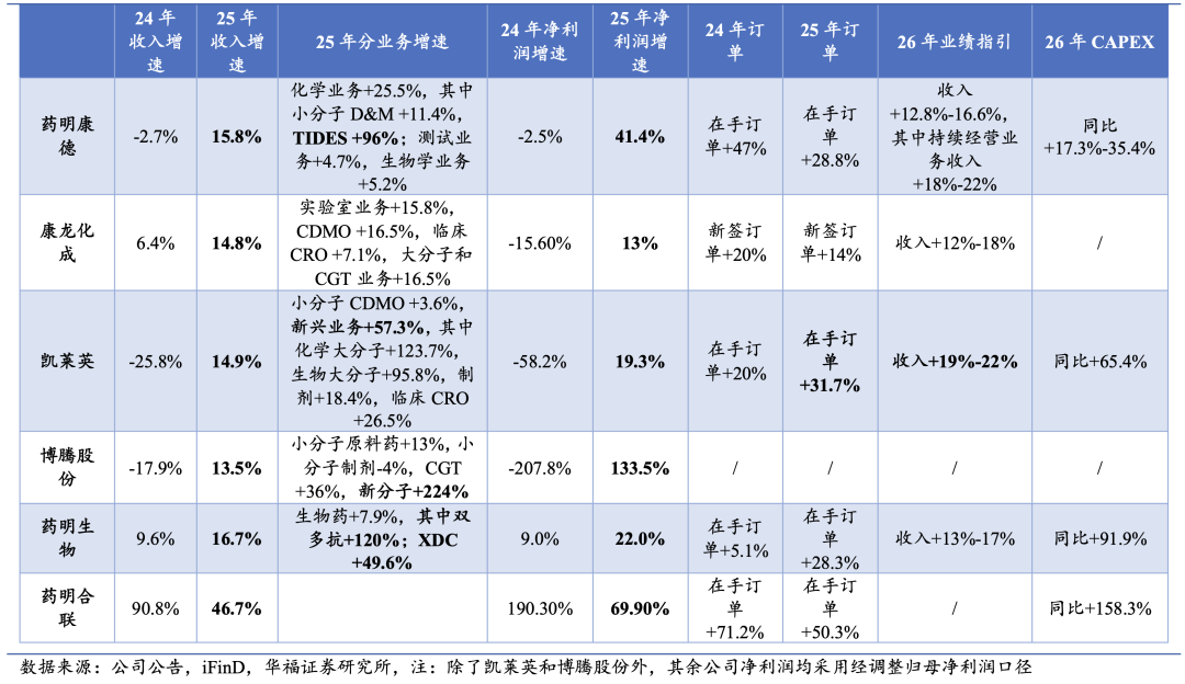 2026年仍将是一个丰收年。大多数CDMO呈现2025Q4收入增长加速、毛利率提升趋势;凯莱英、药明生物在手订单加速增长,药明康德、康龙化成、药明合联维持较快订单增速;凯莱英 2026年收入指引明确加速,其余公司在考虑汇兑波动影响下仍给出稳健的全年收入增速指引;产能扩张方面,凯莱英、药明生物、药明合联2026年CAPEX(资本开支)预计将实现大幅增长。