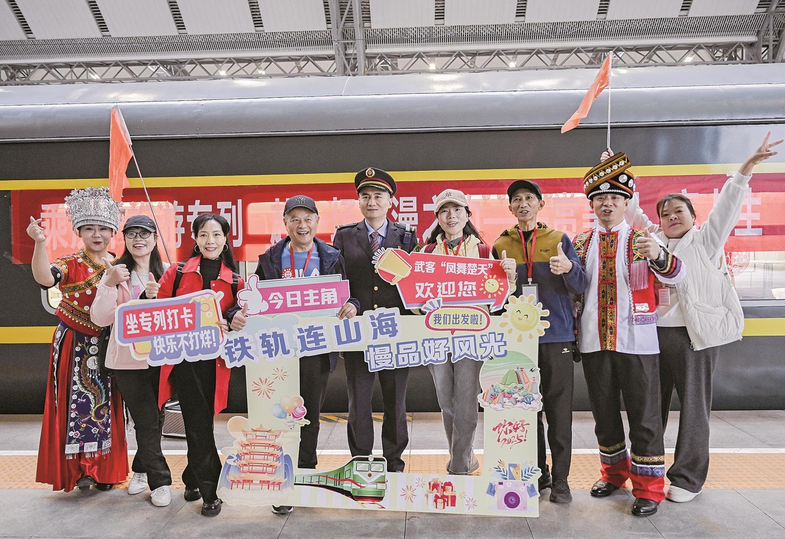 11月11日,Y859次银发旅游专列从湖北汉口站开出,开启为期4天的“探秘十堰”深度游之旅。这趟专列采用“一张车票管全程”模式,免去多次购票、频繁换乘的困扰。图为当日银发游客与工作人员合影。 供图