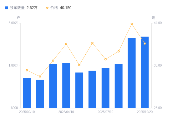 11月12日消息,数据显示,截至2025年11月10日,A股股东总户数为2.89万户,较上期(2025年10月20日)增加2711户,增幅10.36%。公司最新A股总股本为1.55亿股,其中流通A股1.55亿股,户均持有流通A股数量为5367.97股,较上期减少556.21股,降幅9.39%;户均持流通A股市值21.14万元,较上期减少2.65万元,降幅11.13%。