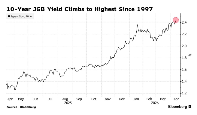 随着特朗普宣布美国将对战略要地霍尔木兹海峡实施全面海上封锁,中东紧张局势进一步升级,日本10年期国债收益率随之攀升至1997年以来的最高水平。
