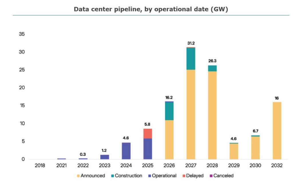 这一缺口在未来数年将进一步扩大。据报道,2027年已宣布的21.5吉瓦规划容量中,实际在建规模仅约6.3吉瓦。2028年至2032年间,绝大多数规划项目甚至尚未破土动工——37吉瓦的规划基础设施中,仅4.5吉瓦已实际开工,且大量项目尚无明确竣工时间表。