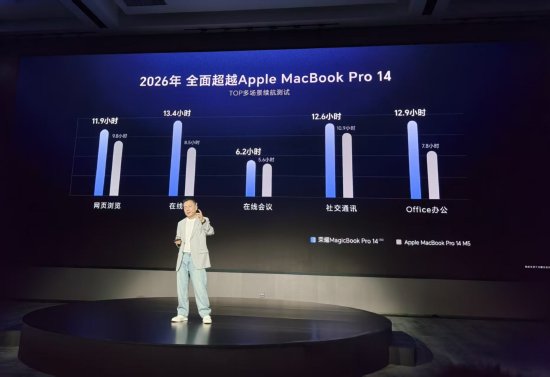 他宣布,荣耀MagicBook系列以HONOR Turbo X技术,创下了16.7小时的X86平台续航纪录,首次超越苹果MacBook Pro 14;另外,荣耀笔记本X Plus系列2026获得行业首个SGS整机卓越可靠性认证,及行业首个键盘IPX2级防水认证。