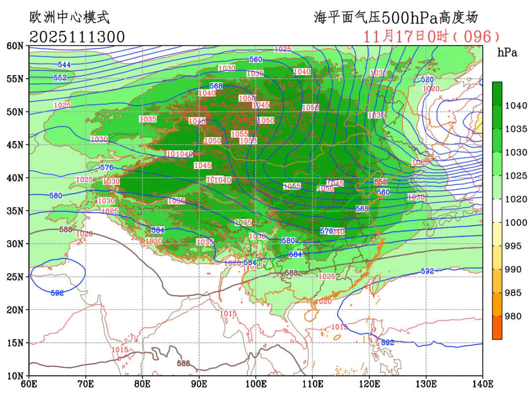 这次寒潮强度强,其冷高压中心可达1055百帕。如果说把我们头顶的天空比喻成一个巨大的“空气海洋”,通常情况下,这个“海洋”的平均压力大约是1010百帕,就像平静的海平面。1055百帕的高压中心会使得空气向四周气压低的地方流动,形成大风。中心气压越高,“推力”就越大,风也就越猛。同时,如此强大的高压,意味着背后有规模巨大的冷空气团,它所到之处,气温便会急剧下降。