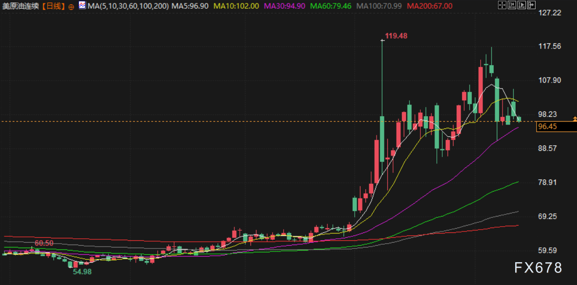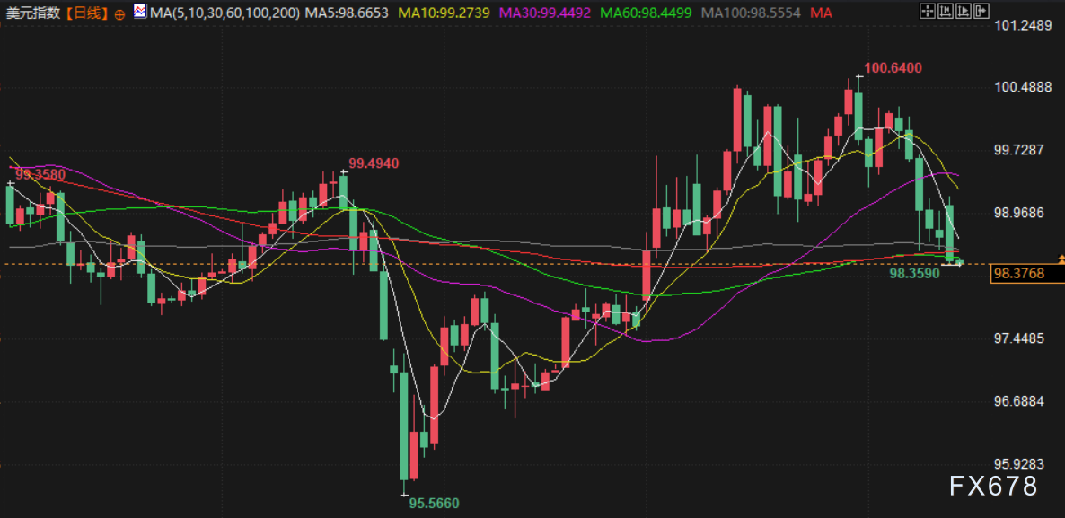 美元指数周一从早盘高位回落并连续第六个交易日下跌,因美伊和平谈判破裂后美国军方开始封锁驶离伊朗港口的船只,德黑兰威胁报复海湾邻国港口,美元指数下跌0.18%至98.54。欧元兑美元上涨0.15%至1.1737美元,澳元和纽元等风险敏感货币走强;油价上涨约40%加剧滞胀担忧,但美元作为避险货币且相对不受进口能源通胀影响,通常在地缘紧张时走强。
