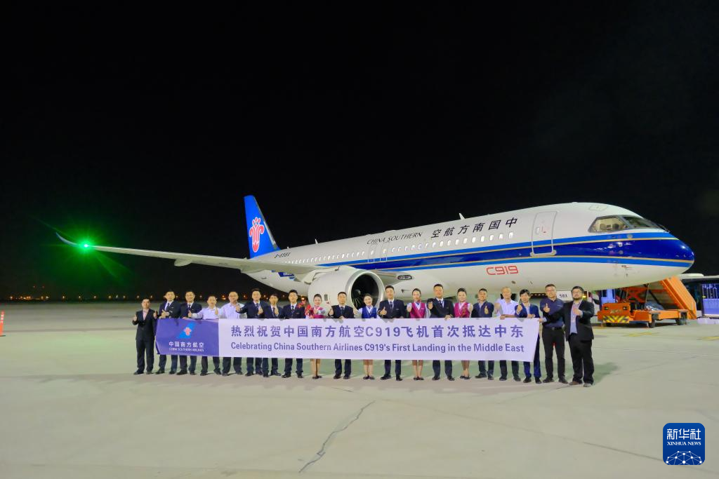新华社迪拜11月14日电(记者夏晓 温新年)据中国南方航空公司提供的消息,中国南方航空一架C919飞机于当地时间14日凌晨1点15分顺利抵达阿联酋迪拜阿勒马克图姆国际机场,参加17日至21日举行的2025年迪拜航空展。这是中国C919大飞机首次在中东亮相。