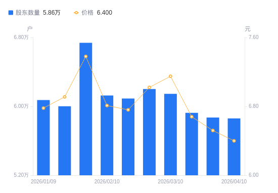 4月14日消息,数据显示,截至2026年4月10日,A股股东总户数为5.86万户,较上期(2026年3月31日)减少109户,降幅0.19%。公司最新A股总股本为7.98亿股,其中流通A股6.14亿股,户均持有流通A股数量为1.05万股,较上期增加19.46股,增幅0.19%;户均持流通A股市值6.71万元,较上期减少1130.6元,降幅1.66%。