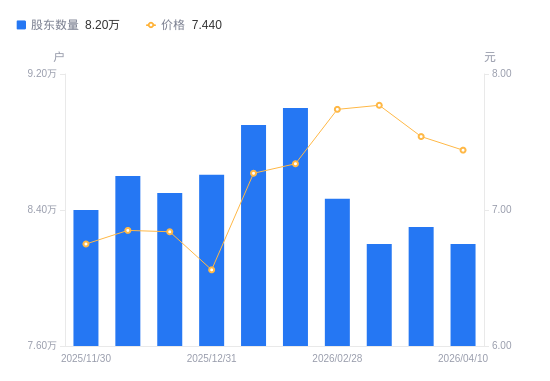 4月13日消息,数据显示,截至2026年4月10日,A股股东总户数为8.2万户,较上期(2026年3月31日)减少1000户,降幅1.20%。公司最新A股总股本为25.91亿股,其中流通A股25.91亿股,户均持有流通A股数量为3.16万股,较上期增加380.63股,增幅1.22%;户均持流通A股市值23.5万元,较上期减少289.28元,降幅0.12%。
