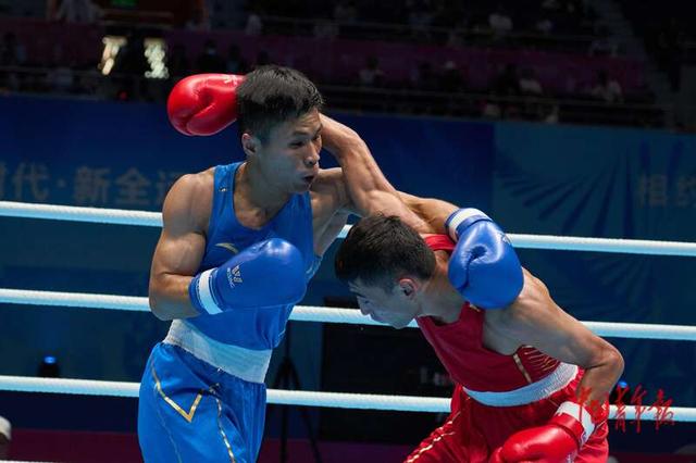 11月14日,广东深圳,宝安体育中心体育馆,十五运会拳击男子60-63.5公斤级决赛,广东队朱健豪(左)与新疆队伊卜拉伊木·马木提在比赛中展开对攻。中青报·中青网记者 田嘉硕/摄