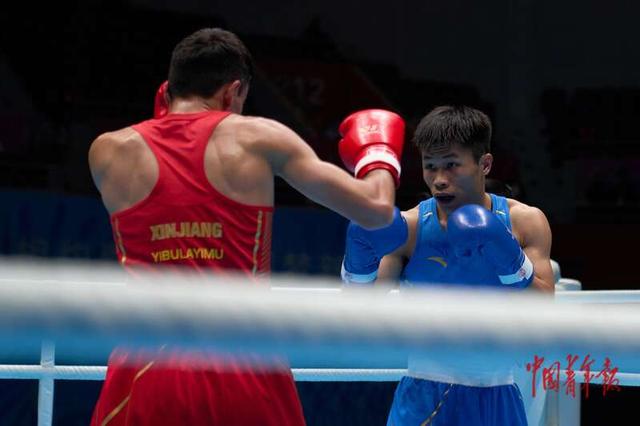 11月14日,广东深圳,宝安体育中心体育馆,十五运会拳击男子60-63.5公斤级决赛,广东队朱健豪(左)与新疆队伊卜拉伊木·马木提在比赛中展开对攻,最终朱健豪摘得该项目桂冠。中青报·中青网记者 田嘉硕/摄