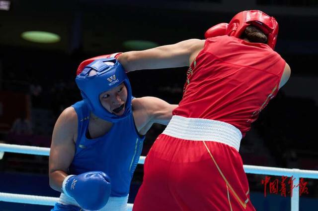 11月14日,广东深圳,宝安体育中心体育馆,十五运会拳击女子70-75公斤级决赛,浙江队叶金(右)击败黑龙江队汪丽娜,夺得浙江拳击全运会历史上的首金。中青报·中青网记者 田嘉硕/摄