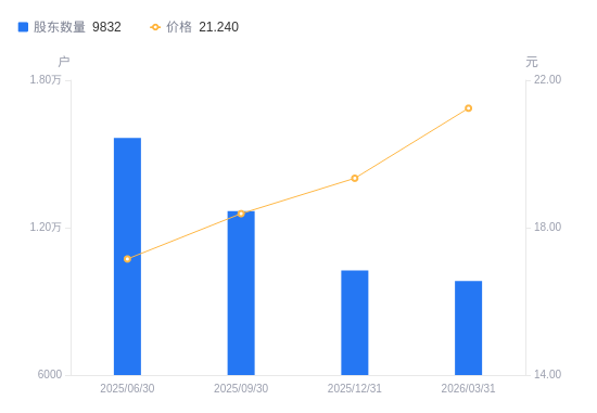 4月14日消息,数据显示,截至2025年12月31日,A股股东总户数为1.03万户,较上期(2025年9月30日)减少2415户,降幅19.06%。公司最新A股总股本为1.24亿股,其中流通A股5053.45万股,户均持有流通A股数量为4928.75股,较上期增加939.61股,增幅23.55%;户均持流通A股市值9.53万元,较上期增加2.2万元,增幅30.01%。