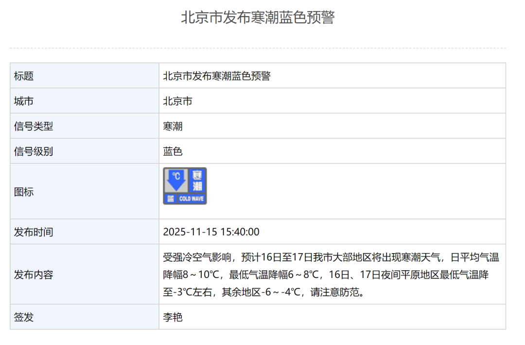 北京市气象局11月15日15时40分发布寒潮蓝色预警:受强冷空气影响,预计16日至17日我市大部地区将出现寒潮天气,日平均气温降幅8~10℃,最低气温降幅6~8℃,16日、17日夜间平原地区最低气温降至-3℃左右,其余地区-6~-4℃,请注意防范。