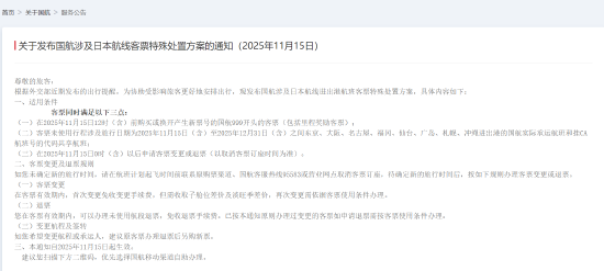 国航表示,在今年11月15日12时(含)前购买或换开产生新票号的国航999开头的客票(包括里程奖励客票);客票未使用行程涉及旅行日期为2025年11月15日(含)至2025年12月31日(含)之间东京、大阪、名古屋、福冈、仙台、广岛、札幌、冲绳进出港的国航实际承运航班和挂CA航班号的代码共享航班;在2025年11月15日0时(含)以后申请客票变更或退票(以取消客票订座时间为准)。在客票有效期内,首次变更免收变更手续费,但需收取子舱位差价及淡旺季差价,再次变更需依据客票使用条件办理。在客票有效期内,可以办理未使用航段退票,免收退票手续费。