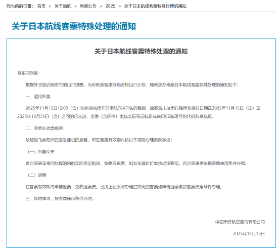 南航表示,2025年11月15日12:00(含)前购买或换开的南航784开头的客票,且客票未使用行程涉及旅行日期在2025年11月15日(含)至2025年12月31日(含)之间的日本进、出港(含经停)南航实际承运航班或使用CZ航班号的代码共享航班。首次变更至相同航程的南航实际承运航班,免收变更费,如发生票价价差按规定收取。再次变更需依据客票使用条件办理。在客票有效期内申请退票,免收退票费。已按上述原则办理过变更的客票如申请退票需按客票使用条件办理。