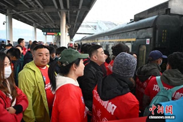 11月15日清晨,在辽宁本溪火车站,K5002次球迷专列搭载着1000 余名本溪球迷奔赴大连梭鱼湾足球场,为第二届辽宁城市足球超级擂台赛总决赛中的本溪队呐喊助威。这趟列车是由中国铁路沈阳局集团公司精心打造的球迷专列。为保障球迷便捷出行,沈阳客运段量身定制了 K5002/1 次往返专列运行方案。列车于 11 月 15 日 7 时 20 分从本溪站准时发车,12时 50分直达大连北站,待总决赛落幕,专列将于 19 时 30 分从大连北站返程。此次专列编组 10 辆,共提供近 1100个座位,充分满足了本溪球迷组团观赛的出行需求。图为球迷在本溪火车站乘车。中新社记者 于海洋 摄