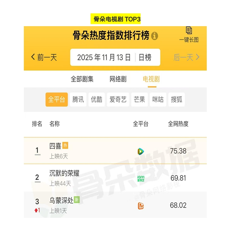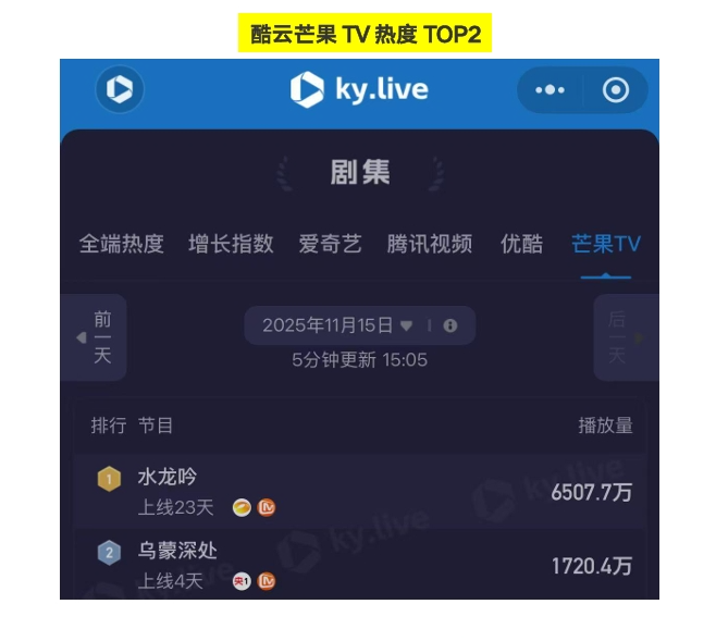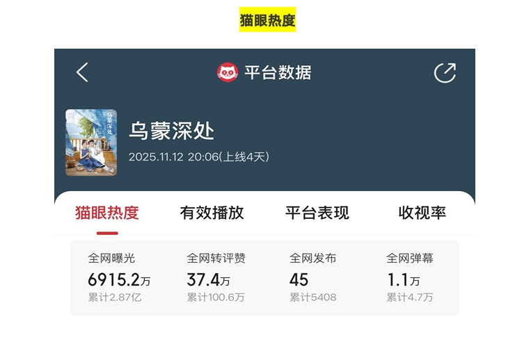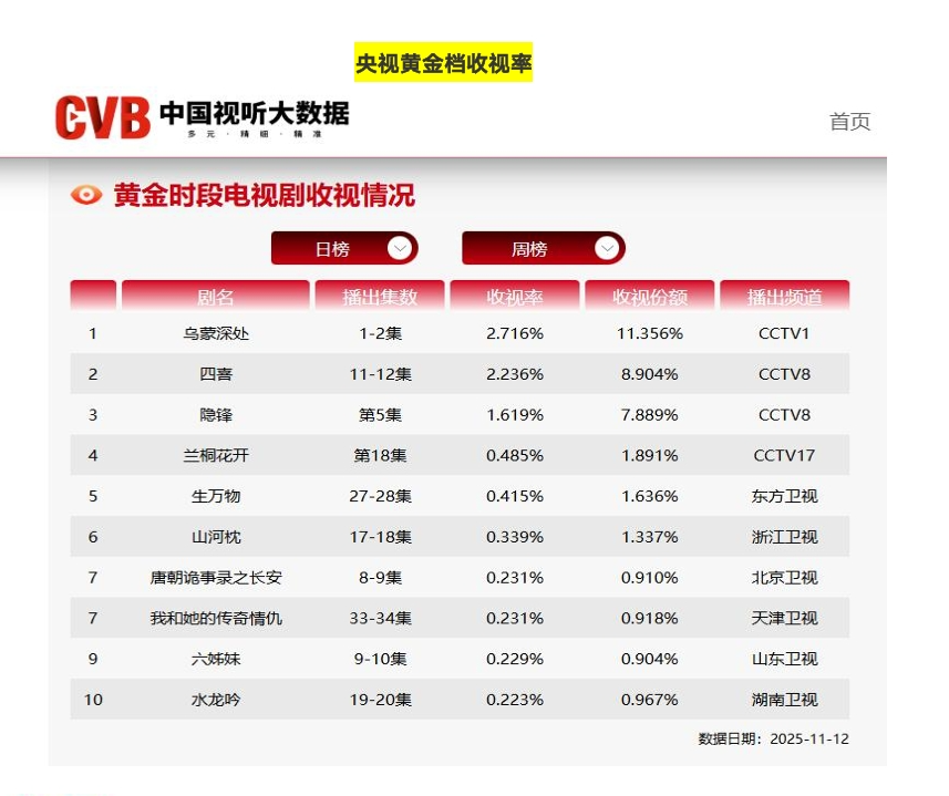 数据显示,11月12日该剧在央视一套收视率2.716%,11月13日收视率2.677%,连续两日登上黄金时段收视率日冠;在芒果站内播放达1.2亿次,登站内热搜榜TOP2;猫眼全热度全网曝光累计超2.87亿次。