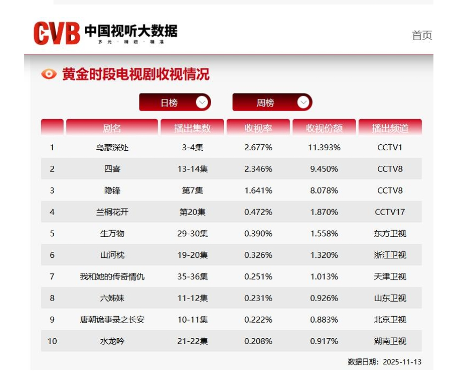 电视剧《乌蒙深处》自11月12日开播至今,连续两日登上收视率日冠,受到观众好评。
