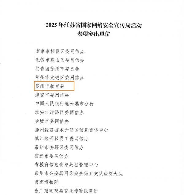 2025年江苏省国家网络安全宣传周期间,苏州市教育局在市委网信办的统一指导下,充分利用各种传播媒介及有效形式,在全市教育系统普及网络安全的基本知识与技能,加强师生网络安全宣传培训,提高师生网络安全防护能力与个人信息保护能力,切实提高师生网络文明素养,强化数字道德伦理规范,为营造全社会共筑网络安全防线的浓厚氛围做出突出贡献。