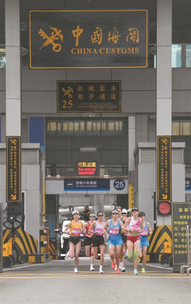 11月15日,参赛选手在比赛中经过深圳湾口岸。当日,第十五届全国运动会田径项目女子马拉松比赛举行。赛事跨越深圳、香港,是全运会历史上首个跨境马拉松赛事。 新华社记者 丁增尼达 摄