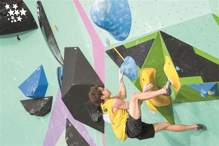 11月15日,湖北队选手潘愚非在比赛中。他最终获得冠军。当日,第十五届全国运动会攀岩项目男子攀石决赛在广州举行。新华社记者 晋美多吉 摄