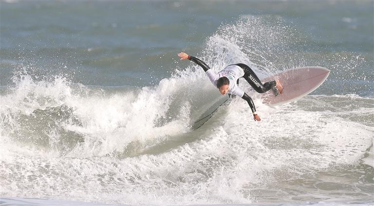 11月15日,辽宁队选手金姝含在比赛中。她以7.10分的成绩晋级半决赛。当日,第十五届全国运动会冲浪女子短板四分之一决赛在广东南澳举行。 新华社记者 卢汉欣 摄