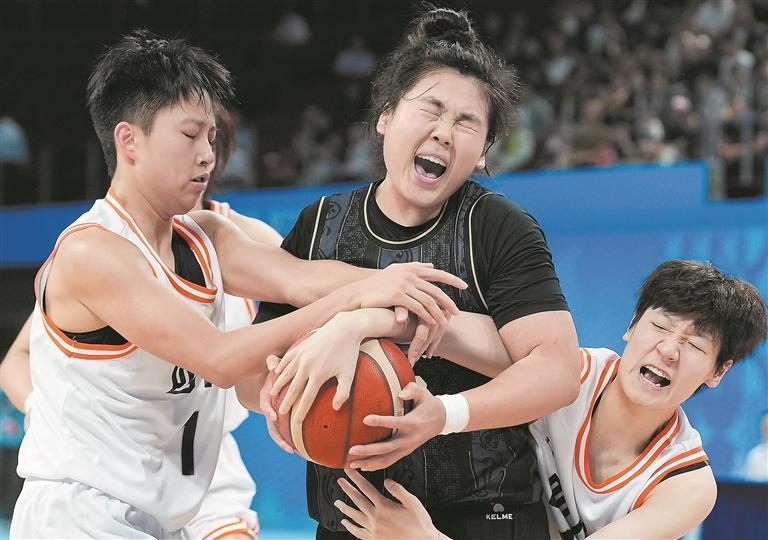 11月15日,江苏队球员赵婧如(中)在比赛中拼抢。当日,在广东省深圳市举行的第十五届全国运动会篮球女子22岁以下组半决赛中,四川队70比59战胜江苏队,晋级决赛。 新华社记者 陈思汗 摄