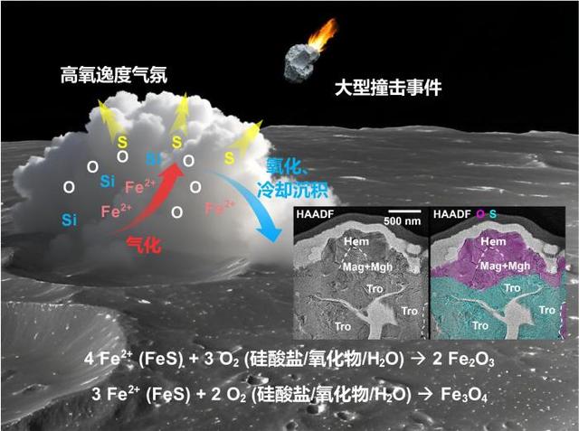 图 3 嫦娥六号样品中发现的铁氧化物成因示意图。图中表示了月球表面物质在大尺度撞击下气化,产生局部的高氧逸度气氛。高温环境使得陨硫铁(FeS)矿物脱硫,并在适当的温度条件(700~1000℃)下被高氧逸度的气氛氧化,形成了赤铁矿(α-Fe2O3)、磁赤铁矿(γ-Fe2O3)和磁铁矿(Fe3O4)。图片来源:山东大学供图