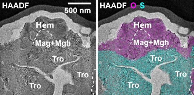 图 1左图是使用透射电子显微镜(TEM)拍摄的赤铁矿晶粒的高角度环形暗场像(HAADF),右图是使用两种特征元素区分的铁氧化物(氧元素,品红色)颗粒和陨硫铁(硫元素,青色)颗粒的接触关系。图片来源:山东大学供图