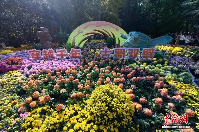 11月15日,四川成都市人民公园内10万余盆菊花竞相绽放,金黄、纯白、淡紫、浅红等色彩交织碰撞,在冬日暖阳的映照下折射出绚烂光泽,引得游人纷纷驻足端详、拍照留念。图为公园里菊花竞相绽放。中新社记者 刘忠俊 摄