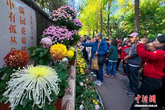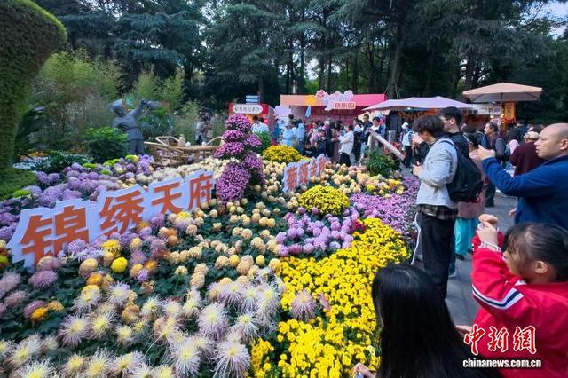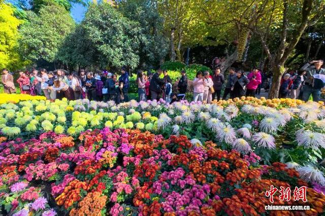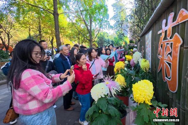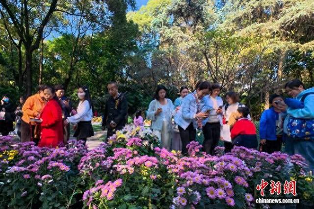 11月15日,四川成都市人民公园内10万余盆菊花竞相绽放,金黄、纯白、淡紫、浅红等色彩交织碰撞,在冬日暖阳的映照下折射出绚烂光泽,引得游人纷纷驻足端详、拍照留念。图为公园里的菊展吸引游人驻足。中新社记者 刘忠俊 摄
