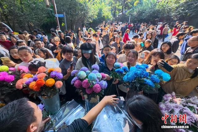 11月15日,四川成都市人民公园内10万余盆菊花竞相绽放,金黄、纯白、淡紫、浅红等色彩交织碰撞,在冬日暖阳的映照下折射出绚烂光泽,引得游人纷纷驻足端详、拍照留念。图为菊展上五颜六色的菊花吸引游人。中新社记者 刘忠俊 摄