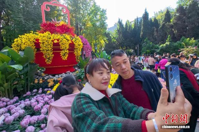 11月15日,四川成都市人民公园内10万余盆菊花竞相绽放,金黄、纯白、淡紫、浅红等色彩交织碰撞,在冬日暖阳的映照下折射出绚烂光泽,引得游人纷纷驻足端详、拍照留念。图为游客在菊花展现场用手机自拍留念。中新社记者 刘忠俊 摄