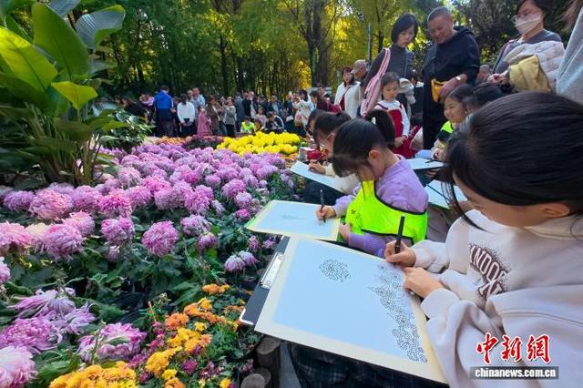 11月15日,四川成都市人民公园内10万余盆菊花竞相绽放,金黄、纯白、淡紫、浅红等色彩交织碰撞,在冬日暖阳的映照下折射出绚烂光泽,引得游人纷纷驻足端详、拍照留念。图为孩子在公园里画菊花。中新社记者 刘忠俊 摄