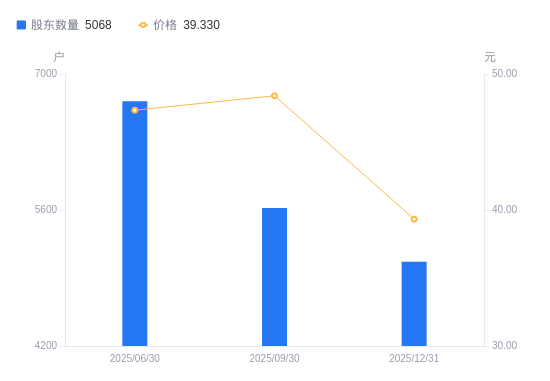 4月15日消息,数据显示,截至2025年12月31日,A股股东总户数为5068户,较上期(2025年9月30日)减少553户,降幅9.84%。公司最新A股总股本为7270万股,其中流通A股3661万股,户均持有流通A股数量为7223.76股,较上期增加710.68股,增幅10.91%;户均持流通A股市值28.41万元,较上期减少3.11万元,降幅9.87%。