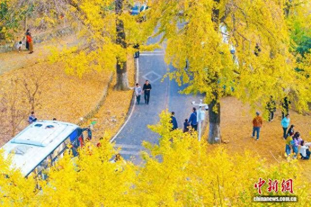 图为游客在银杏树下玩耍。张倩龙 摄