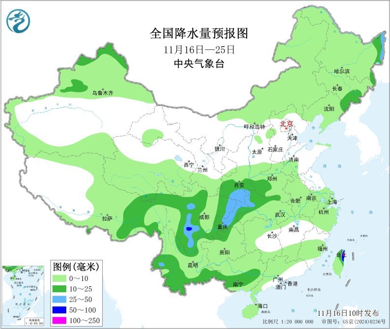 未来10天(11月16-25日),东北地区东部、陕西南部、河南西南部、四川盆地东部、云南南部、川西高原、西藏东部、广西南部及台湾岛东部等地累计降水量有10~20毫米,部分地区30~50毫米,台湾岛东北部70~90毫米,局地超过100毫米;除四川盆地、陕西南部、河南西南部、内蒙中部、川西高原等地降水量较常年同期偏多3~6成,局地偏多1倍以上外,我国其他大部地区降水量显著偏少,其中,华北、黄淮东部、江淮、江南及华南东部的大部地区累计降水量不足2毫米或无有效降水。