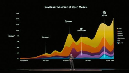 北京时间10月29日凌 晨,黄仁勋在2025 GTC 大会上发表主旨演讲时称, 2025年以来,来自中国的阿里通义千问Qwen已占据开源模型的大部分市场份额,并且领先优势还在持续扩大中。