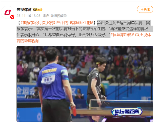 第四次进入全运会男单决赛,樊振东表示:“其实每一次的决赛对当下的我都是陌生的。”再次能感受这样的赛场,他表示很开心。“我希望自己能做好,也会努力去做好。”