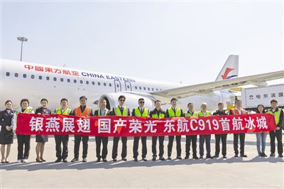 4月15日,工作人员在哈尔滨太平国际机场合影留念。4月15日11时56分,搭载140名旅客的MU5631航班平稳降落在哈尔滨太平国际机场,东方航空C919国产大飞机哈尔滨—上海航线成功首航,标志着国产大飞机正式投入东北至长三角核心航线。