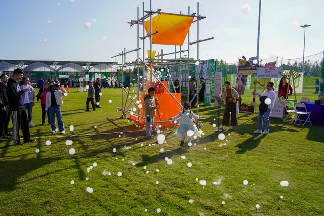 绿茵网球场上的铃兰艺术装置。沈思怡 摄澳大利亚皇家墨尔本理工大学的《芦影・共生》则更具互动性,该作品以奉贤珍稀鸟类震旦鸦雀及其赖以生存的芦苇湿地为灵感,通过竹筏与芦苇构建漂浮生态装置,呼吁公众关注湿地保护。游客可划着皮划艇为鸟类补给食物,带走印着湿地保护知识的生态纸袋上。“玩的时候还能学东西,孩子很喜欢。”来自市区的游客李女士说。