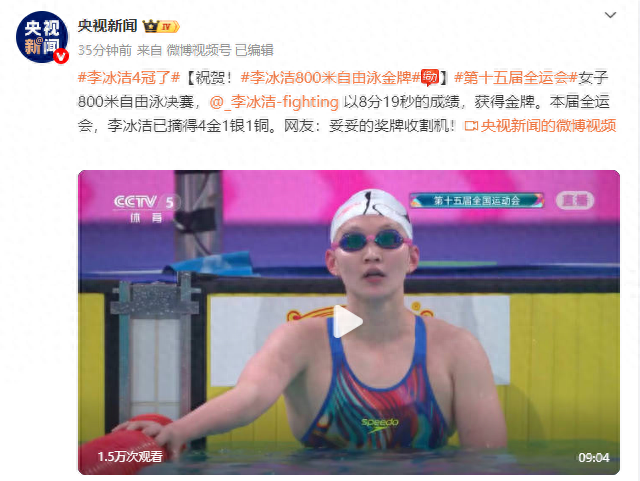 第十五届全运会女子800米自由泳决赛,李冰洁以8分19秒的成绩,获得金牌。本届全运会,李冰洁已摘得4金1银1铜。