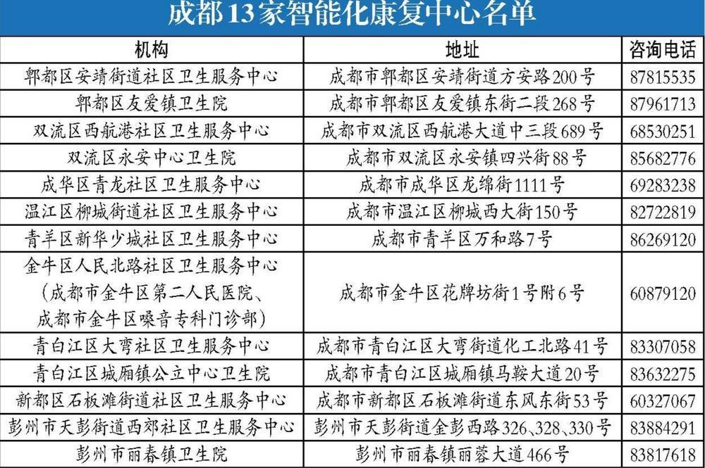 记者从成都市卫健委了解到,当前,包括新华少城社区卫生服务中心、青龙社区卫生服务中心、彭州市丽春镇卫生院在内,成都已经建成12家智能化康复中心,金牛区人民北路社区卫生服务中心的智能化康复中心预计11月底全部投入运营。