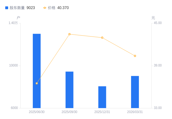 4月16日消息,数据显示,截至2025年12月31日,A股股东总户数为8052户,较上期(2025年9月30日)减少1382户,降幅14.65%。公司最新A股总股本为1.37亿股,其中流通A股5024.42万股,户均持有流通A股数量为6239.96股,较上期增加914.1股,增幅17.16%;户均持流通A股市值26.8万元,较上期增加3.67万元,增幅15.84%。