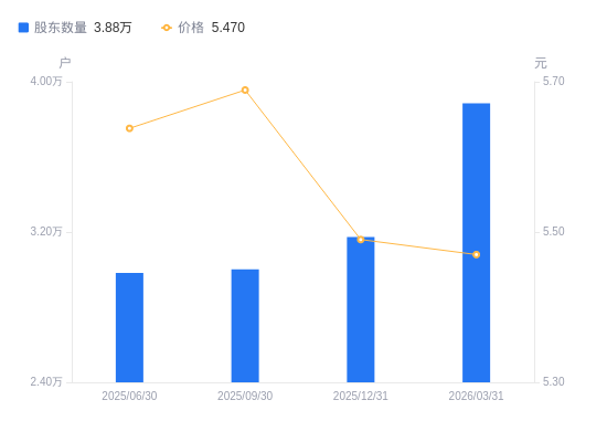 4月16日消息,数据显示,截至2026年3月31日,A股股东总户数为3.88万户,较上期(2025年12月31日)增加7112户,增幅22.41%。公司最新A股总股本为15.61亿股,其中流通A股15.61亿股,户均持有流通A股数量为4.02万股,较上期减少9005.54股,降幅18.31%;户均持流通A股市值21.98万元,较上期减少5.02万元,降幅18.61%。