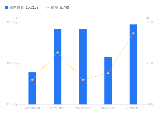 4月16日消息,数据显示,截至2025年12月31日,A股股东总户数为13.76万户,较上期(2025年12月11日)减少1.26万户,降幅8.36%。公司最新A股总股本为25.97亿股,其中流通A股25.97亿股,户均持有流通A股数量为1.89万股,较上期增加1578.33股,增幅9.13%;户均持流通A股市值8.98万元,较上期增加1.03万元,增幅12.92%。