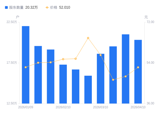 4月16日消息,数据显示,截至2026年4月10日,A股股东总户数为20.32万户,较上期(2026年3月31日)减少6857户,降幅3.26%。公司最新A股总股本为10.61亿股,其中流通A股10.61亿股,户均持有流通A股数量为5223.08股,较上期增加170.52股,增幅3.37%;户均持流通A股市值27.17万元,较上期增加2.92万元,增幅12.03%。