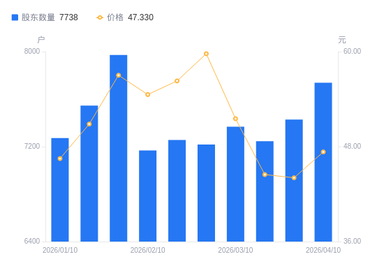 4月16日消息,数据显示,截至2026年4月10日,A股股东总户数为7738户,较上期(2026年3月31日)增加310户,增幅4.17%。公司最新A股总股本为4亿股,其中流通A股1.61亿股,户均持有流通A股数量为2.08万股,较上期减少869.84股,降幅4.01%;户均持流通A股市值98.65万元,较上期增加2.98万元,增幅3.12%。