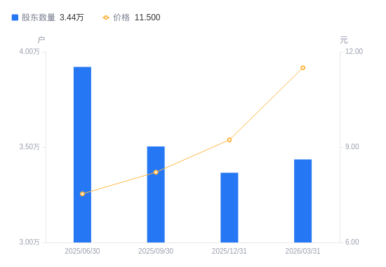 4月17日消息,数据显示,截至2026年3月31日,A股股东总户数为3.44万户,较上期(2025年12月31日)增加707户,增幅2.10%。公司最新A股总股本为7.77亿股,其中流通A股7.77亿股,户均持有流通A股数量为2.26万股,较上期减少475.04股,降幅2.06%;户均持流通A股市值26万元,较上期增加4.69万元,增幅22.03%。